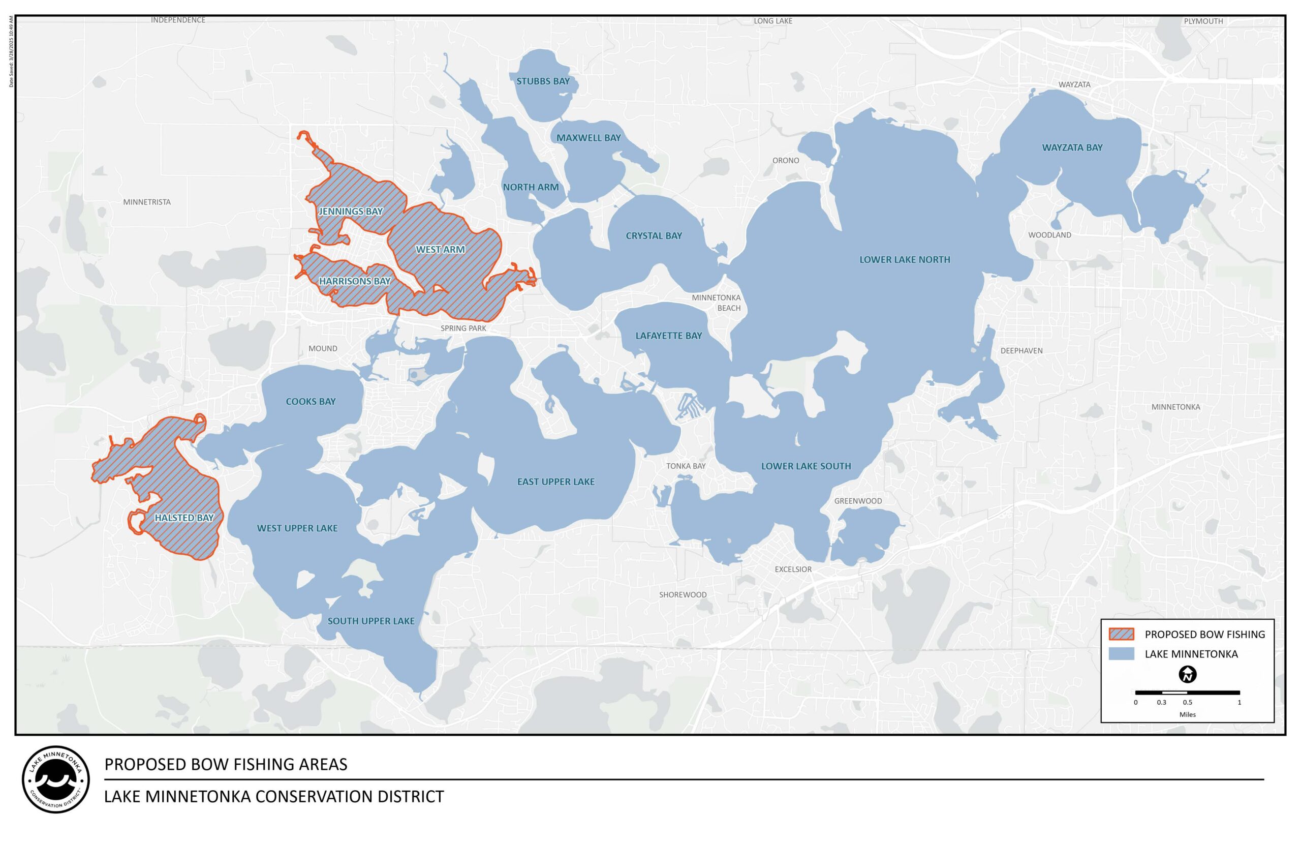 A Special Event Permit has been approved by the LMCD Board which will allow Nighttime Bow Fishing on four bays of Lake Minnetonka for a limited event period of April 24, 2025 through June 30, 2025. Users can bow fish on Harrisons Bay, West Arm, Jennings, and Halstead Bay from one half hour after sunset until 1am. The Special Event Permit must be carried by each participant.
